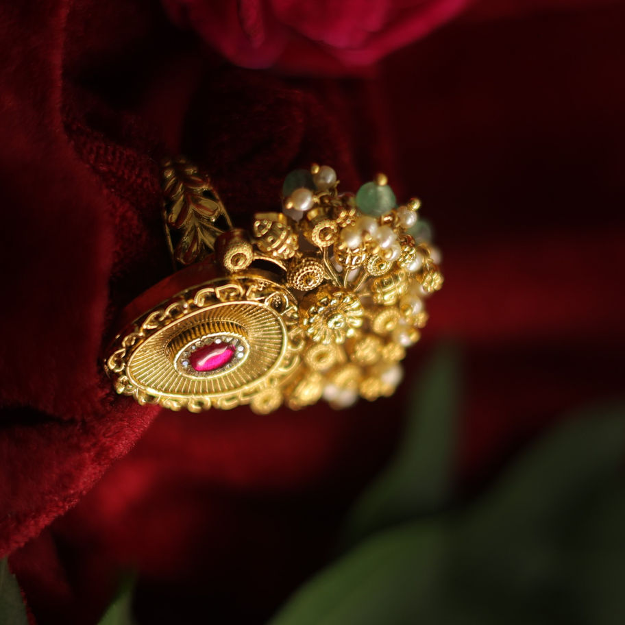 Discover the timeless elegance of our exquisite Gold-Tone piece adorned with a mesmerizing Ruby Stone and delicate Pearl Accents, masterfully crafted in an Antique Design. At Tangilal Jewellers, we pride ourselves on offering luxury jewellery that embodies sophistication and heritage. Each piece is intricately designed to capture the essence of opulence, making it a perfect addition to any discerning collector's ensemble. Elevate your jewellery collection with this statement piece, designed to be cherished for generations. Experience the unparalleled craftsmanship and personalized service that Tangilal Jewellers is renowned for.