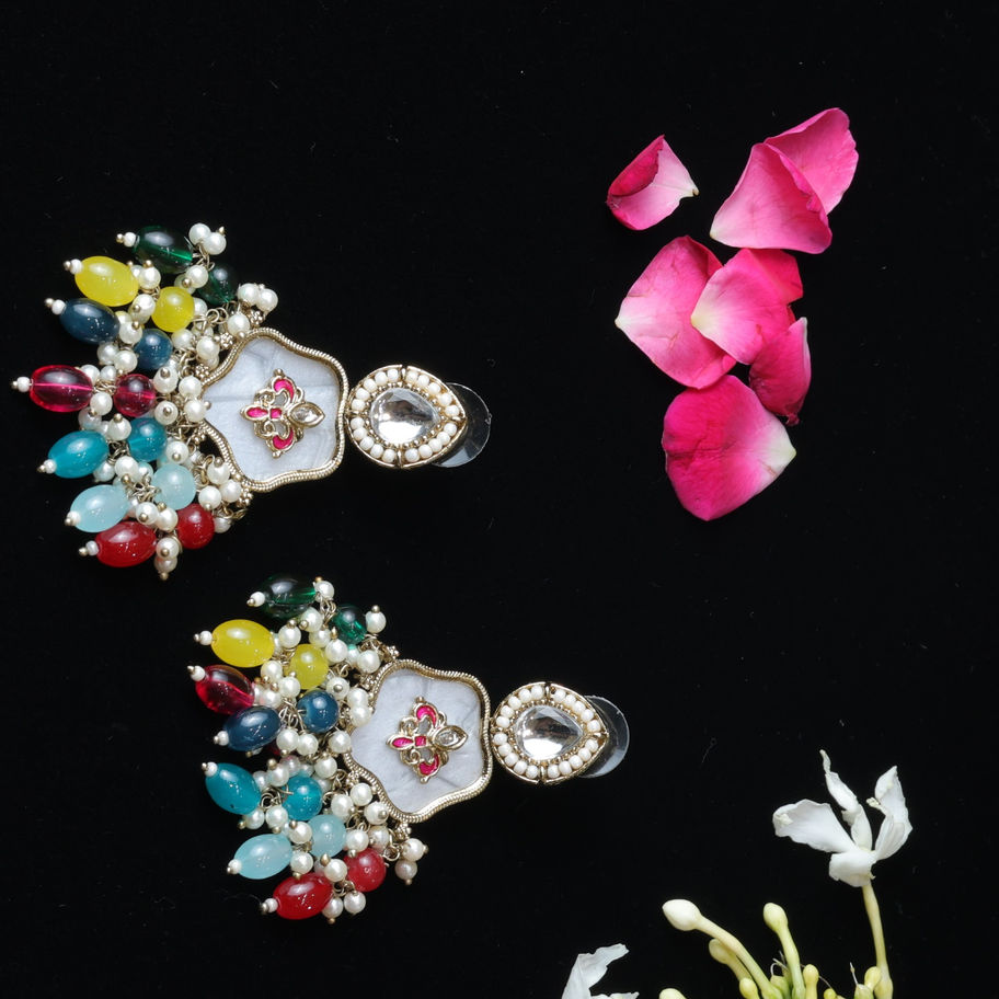 Multicolored Pearl Drop Earrings, Crystal Studded Chandelier Design