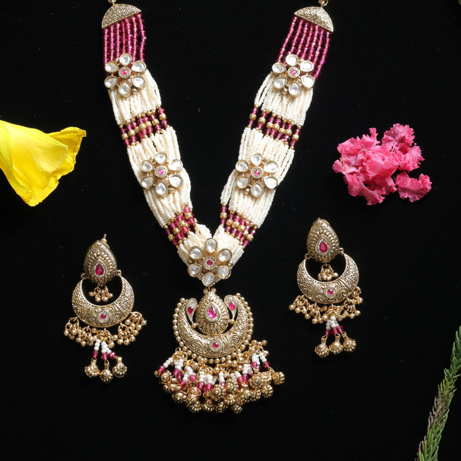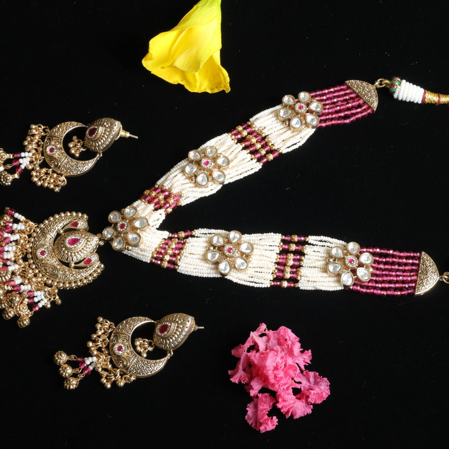 Traditional Pearl and Ruby Beaded Necklace Set, White and Pink
